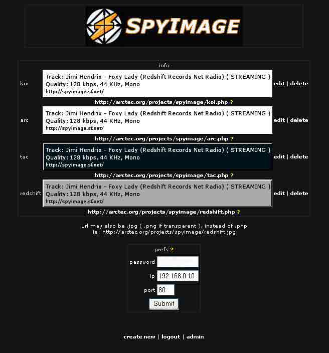 SpyImage is a server-based web application that parses data from a client's SpyAmp page to produce an image. The image is updated dynamically whenever it is refreshed or loaded. Great for forum sigs and other such stuff. SourceForge project page here: http://sourceforge.net/projects/spyimage/ More information available here: http://arctec.org/projects/spyimage/ Example ( Static ):
